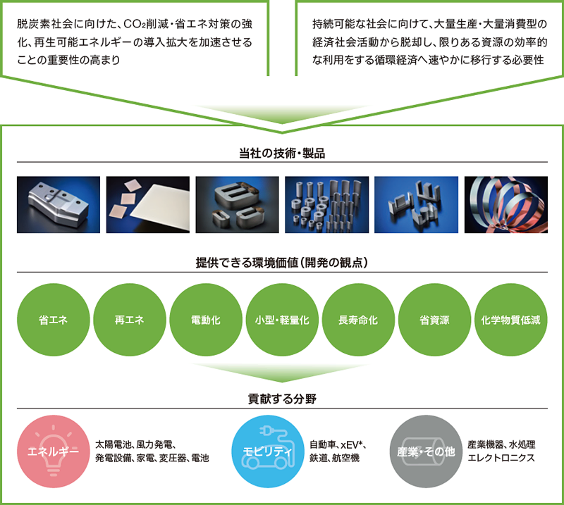 xEV製造に不可欠な材料、電力の損失を低減する材料、お客様の製品や部材の長寿命化に貢献する材料などの環境親和型製品で環境負荷低減に貢献します。
