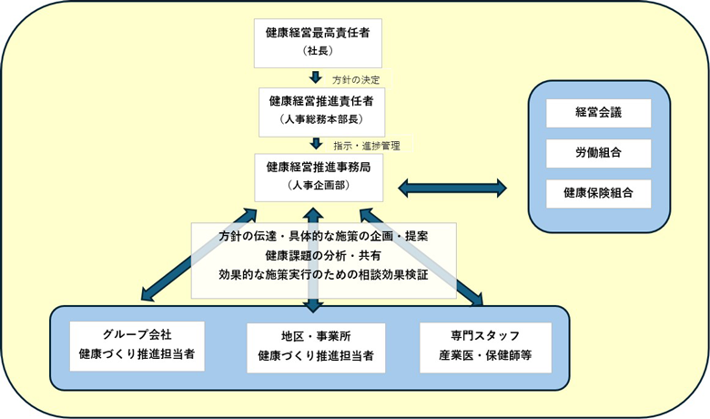当社は2019年6月に第一回目の健康宣言を行い、「からだの健康」「こころの健康」「健全な職場づくり」を施策の柱とし、全社的な活動と合わせて、事業所毎の課題にそった施策展開を行っています。