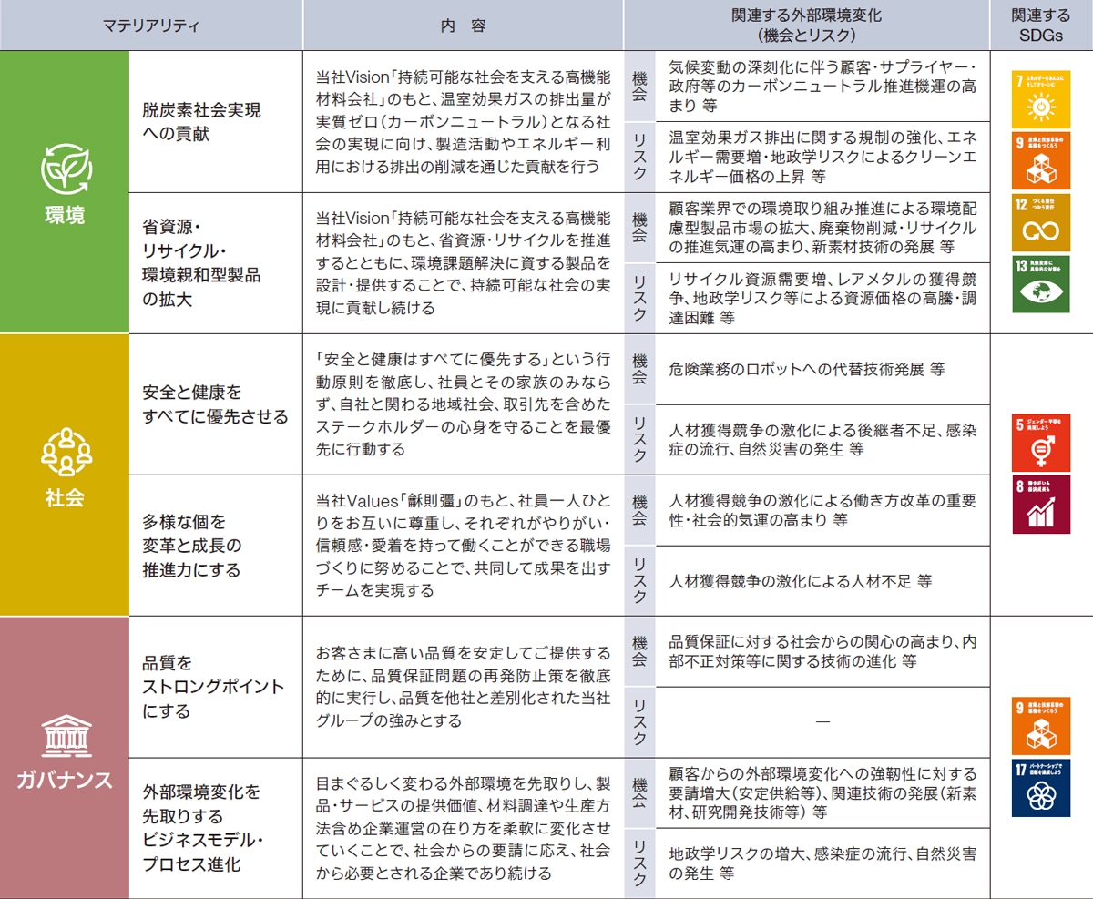 プロテリアルは環境・社会・ガバナンスで特定した6つのマテリアリティに対応する主要施策を設けるとともに、主要施策の進行状況を管理するための指標を各施策に設定しています。この重要管理指標の目標数値は2030年度を期限としており、目標の達成に向けて着実な施策の実施を推進していきます。