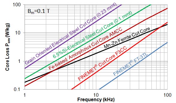 ナノ結晶軟磁性材料ファインメット® FT-3TL材を使用したノンカットコアは、ファインメット® F3CCシリーズカットコアと比較して損失が1/3~1/4程度と低く、Mn-Znフェライトに比べ約3倍の飽和磁束密度を持つため、高周波トランスの低損失化と小型・軽量化に貢献します。