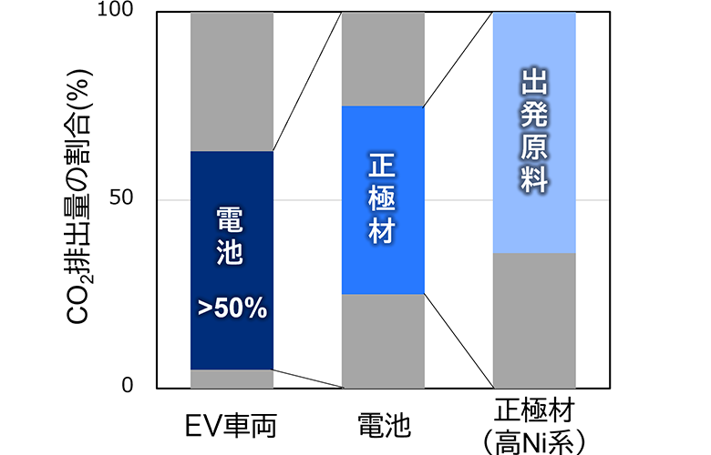脱炭素社会の実現に向けて電気自動車(以下、EV)の需要が高まっており、EVに不可欠な重要部材であるLIBの市場も注目を集めています。しかし、その製造過程における環境負荷は大きく、EV製造全体のCO2排出量の50%以上を占めています。特にLIBの製造過程の中でも正極材とその出発原料※1に由来するCO2排出量比率が高く(図1)、大きな課題となっていました。また、正極材の製造過程で硫酸系廃棄物(Na2SO4)が排出され、その処理のために多くの水が必要となる課題もありました。