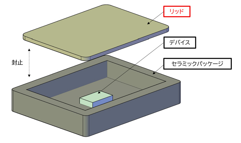 あらかじめ成形された低融点の金錫ろう材層を用いて、リフロー工程により封止するリッドです。低融点での封止が可能なため、高気密性が求められる高性能デバイスの製造に好適です。